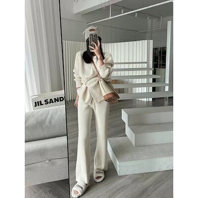 秋冬 新作 おしゃれ 気質 ニット アウター 二点セット レディースセットアップ 上下セット セーター ワイドパンツ セットアップ 通勤 シンプル 福袋