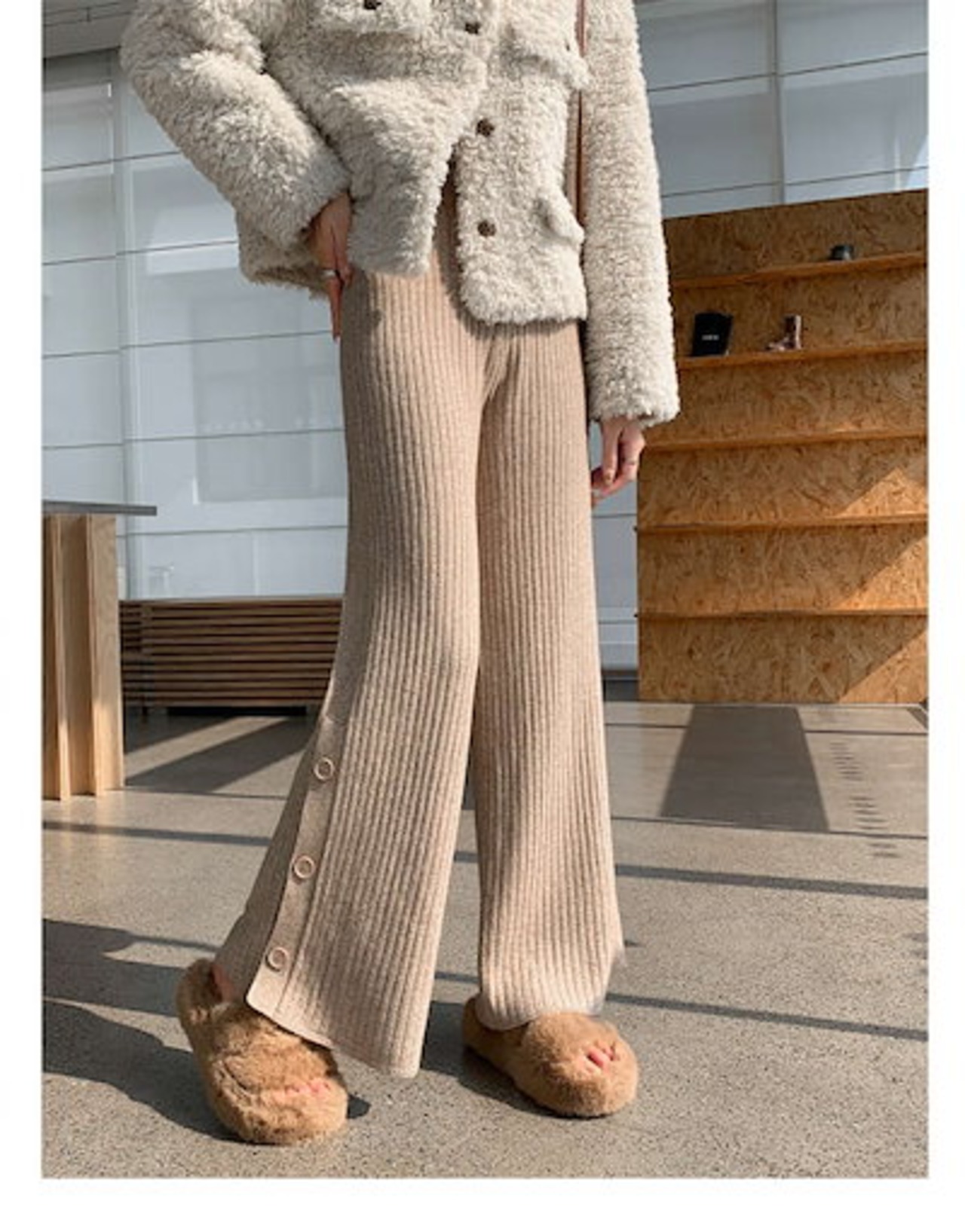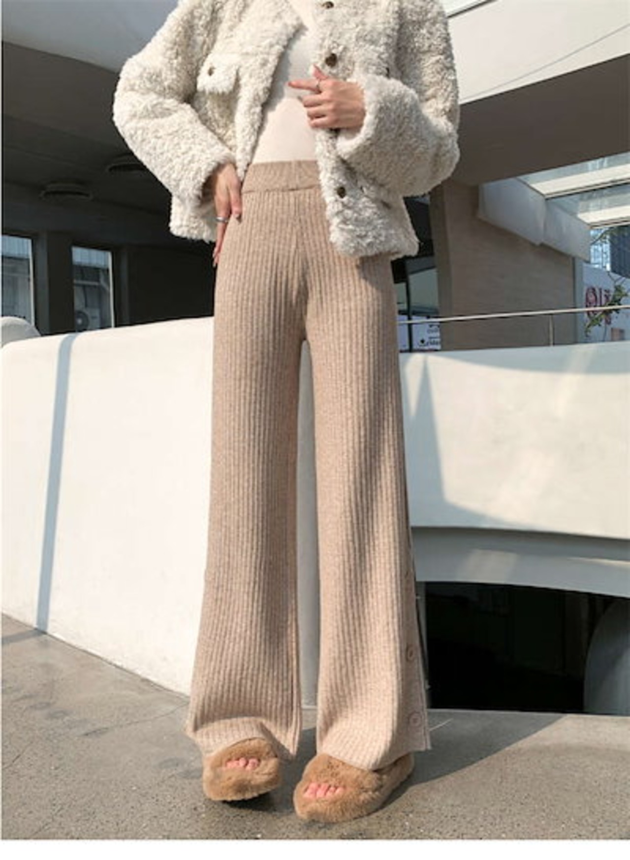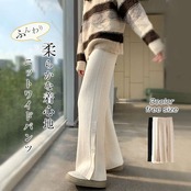 ハイウエスト フレア パンツ ワイドパンツ フレアパンツ ワイド 無地 レディース ゴム ボトムス サイドスリット ニットパンツ ワンマイルウェア きれいめ ガウチョパンツ リブニット ゆったり ロン