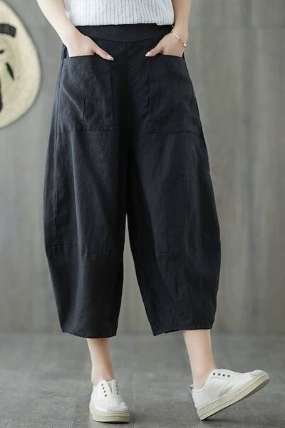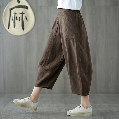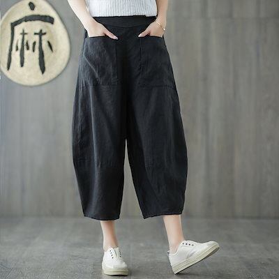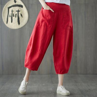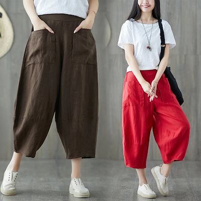 「ファットガール」 八分丈 コットン リネン カプリパンツ レディース 夏 ゴムウエスト 麻 ブルマ ハイウエスト カジュアルパンツ 七分丈 メガ割