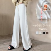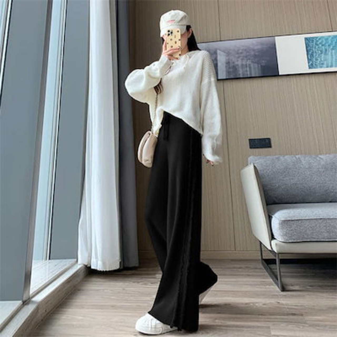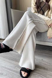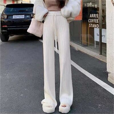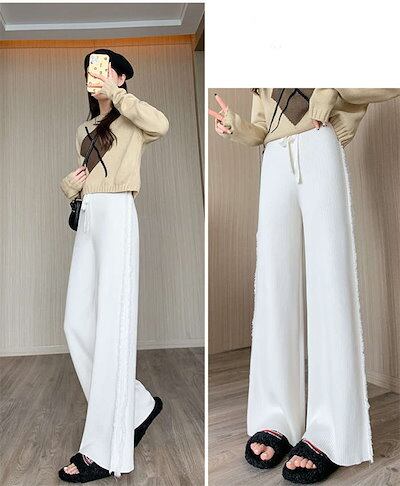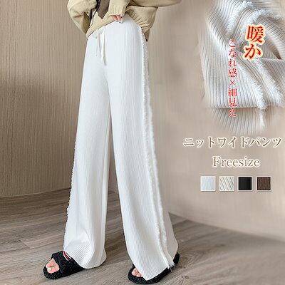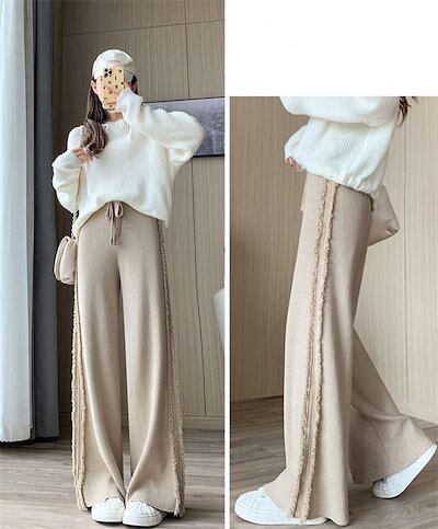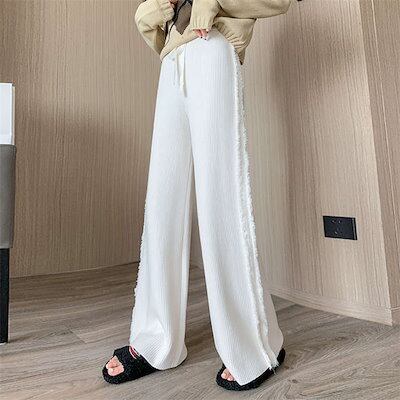リブニット 伸縮性 リラックス ボトムス ニット ウエストゴム 美脚 ワイドパンツ レディース フレアパンツ 無地 ゆるパンツ 春 楽ちん ストレートパンツ リブ タッセル 秋冬 秋 冬 ロングパンツ