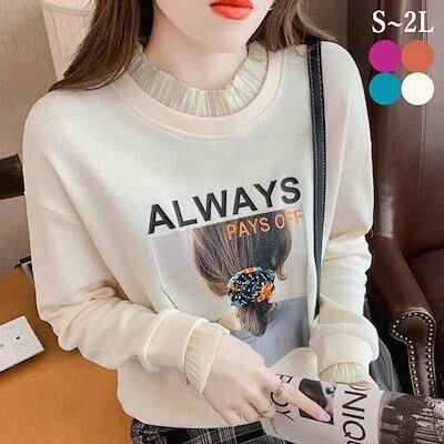 トレーナー Tシャツ 切替 スウェット レース コットン パーカー ロゴ プリント フリルネック フリル袖 トップス ルームウエア レディース 長袖 ゆったり 大きいサイズ 春 秋 冬 S M今日
