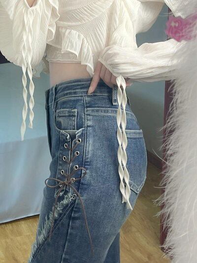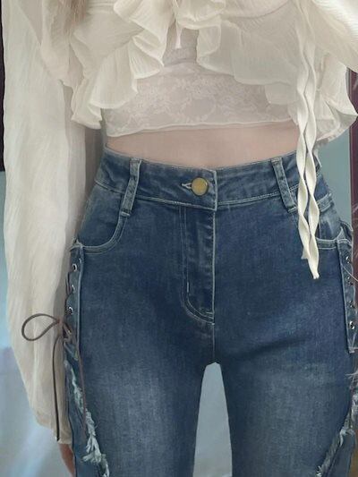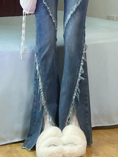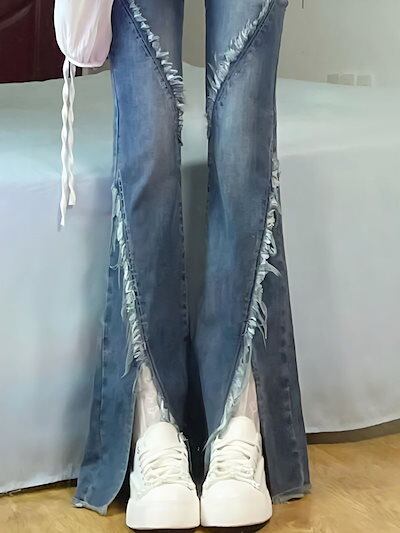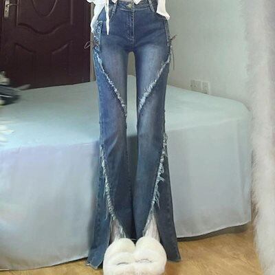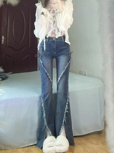 レトロ スリット ジーンズ 夏秋 ハイウエスト スリミング フレアパンツ レディースファッション 百掛け モップ ロングズボン ジーパン