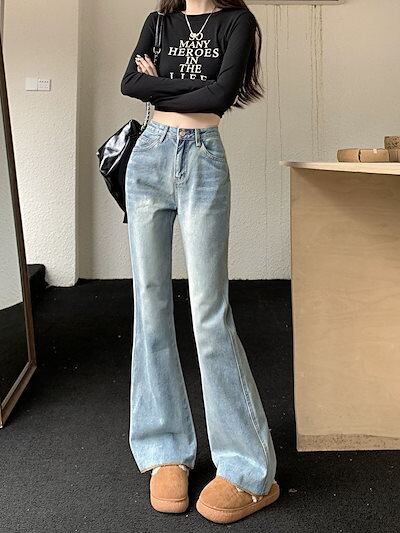 アメリカンブルーのワイド脚フレアジーンズレディース新型ハイウエストでゆったりとした着痩せストレートの毛並みが長めのパンツ デニムパンツ メガ割 テーパードパンツ デニムパンツ