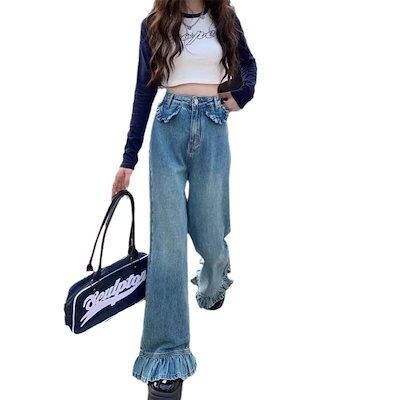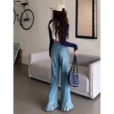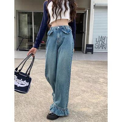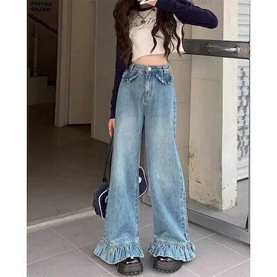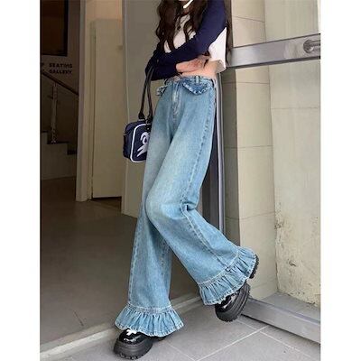 夏 ひんやりボトムス デニムパンツ モップパンツ ラッフル ワイドパンツ フレアパンツ ストレート ロングズボン レディース 体型カバー 個性デザイン 着やせ