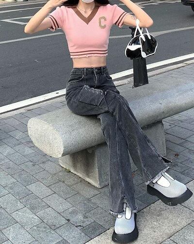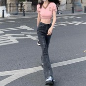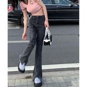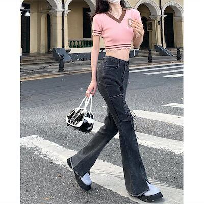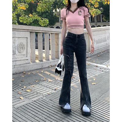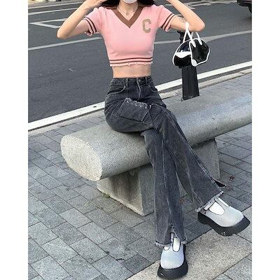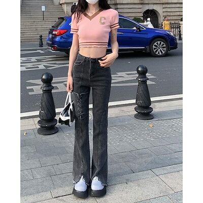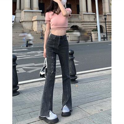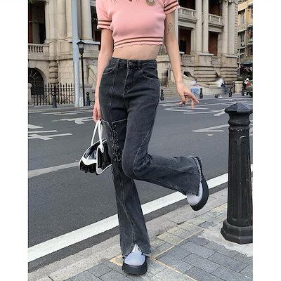 スリット 着痩せ フレアパンツ レディース ハイウエスト デニムパンツ デザイン感 ストレート ロングズボン