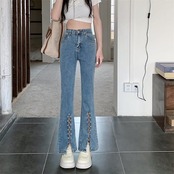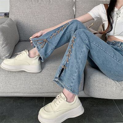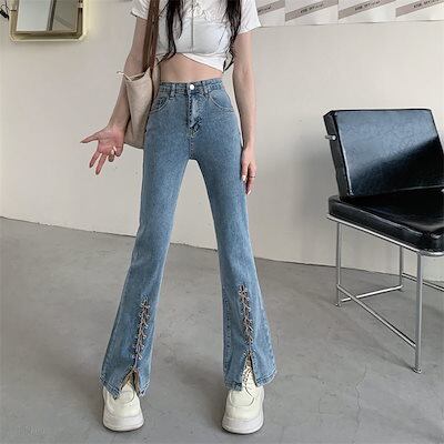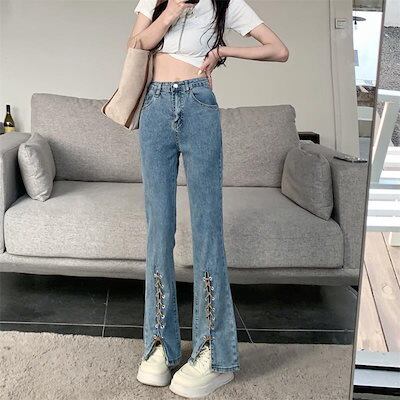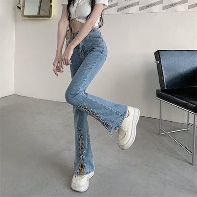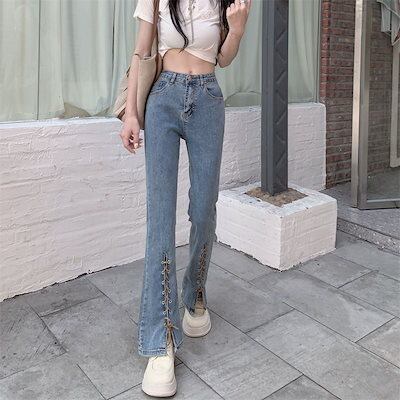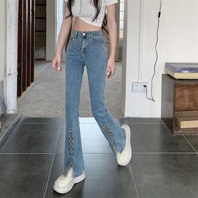 ハイウエスト 着痩せ フレアパンツ レディース 新しい スリット ジーンズ おしゃれ 百掛け デニム ロングズボン