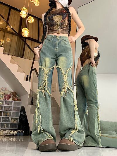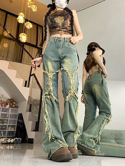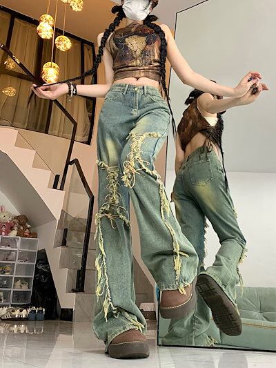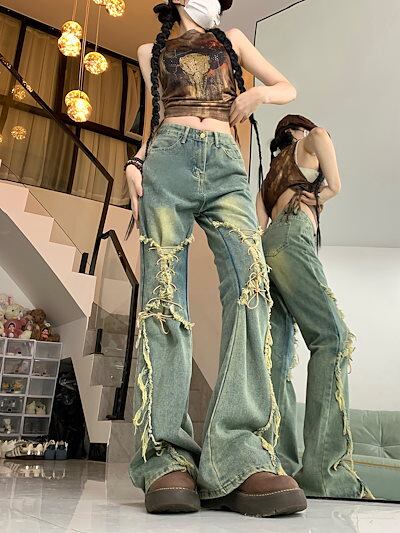 2024秋冬 韓国トレンドデニムパンツ ボトムス ジーンズ デザインファッション系スタイル ゆるダボ ジーンズ シルエット加工ゆったり レディース カジュアルコーデ 春夏 メンズライク