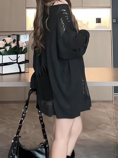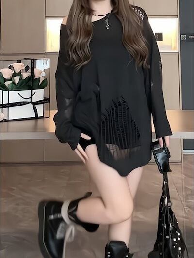2024秋冬 長袖 ニット トップスストリート黑カジュアエコルシルエットプルクルーネックファッション加工色っぽ 女っぽ カジュアル 大人っぽ 上品 サイズフェミニンゆったりレディース系透かし編み