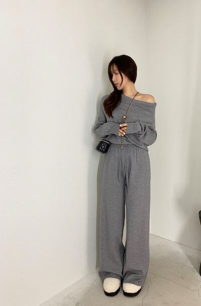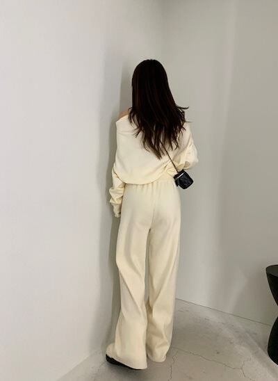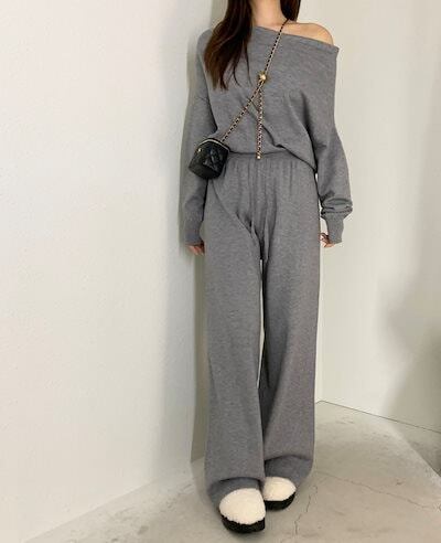 2024秋冬セットアップ トップス ニット長袖 ワンショルダー ロングパンツ ワイド ストレート ゆったり 秋 白 黒 おしゃれ かわいい 韓国ファッション レディース お出かけ