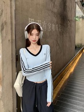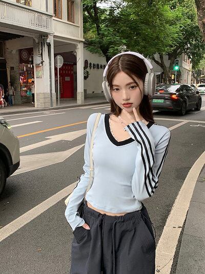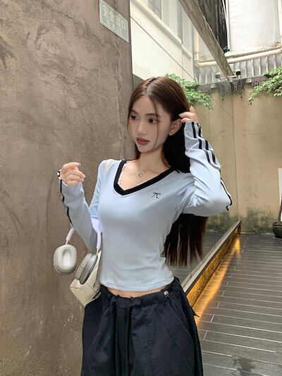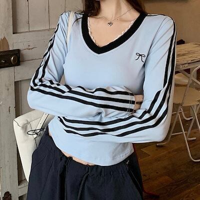 2024 秋冬トップス Tシャツ 長袖 Vネック ストライプ Vネック スリム 細見え 秋 ライトブルー おしゃれ かわいい 韓国系ファッション衣装 レディース お出かけ