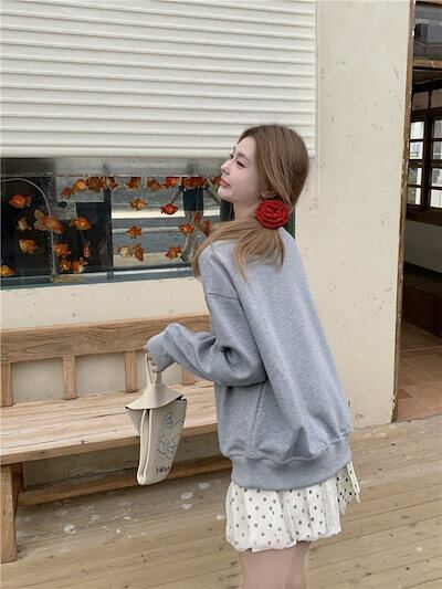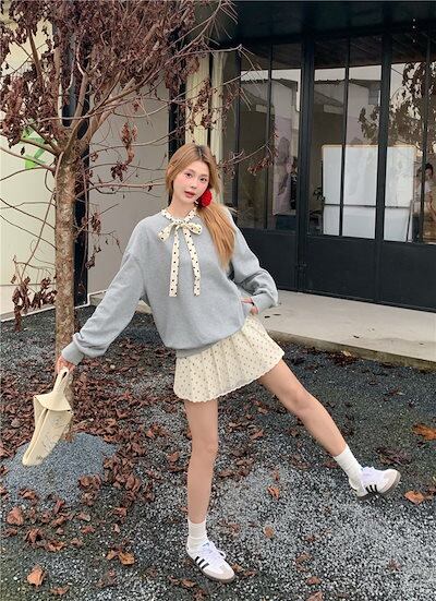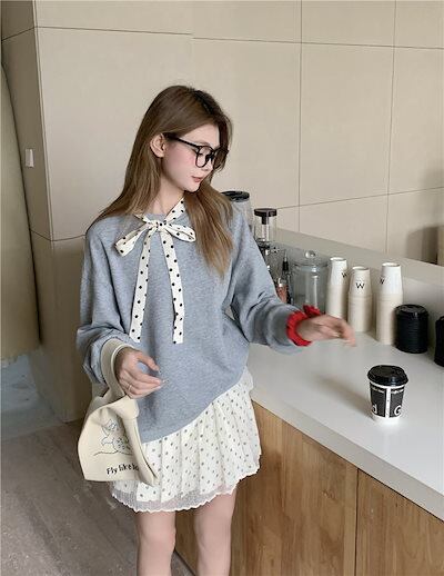2024秋冬トップス 長袖 ラウンドネック スカート ミニ丈 ドット柄 ゆったり 秋 白 黒 おしゃれ かわいい ガーリー キュート 甘め 韓国ファッション レディース お出かけ