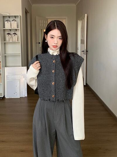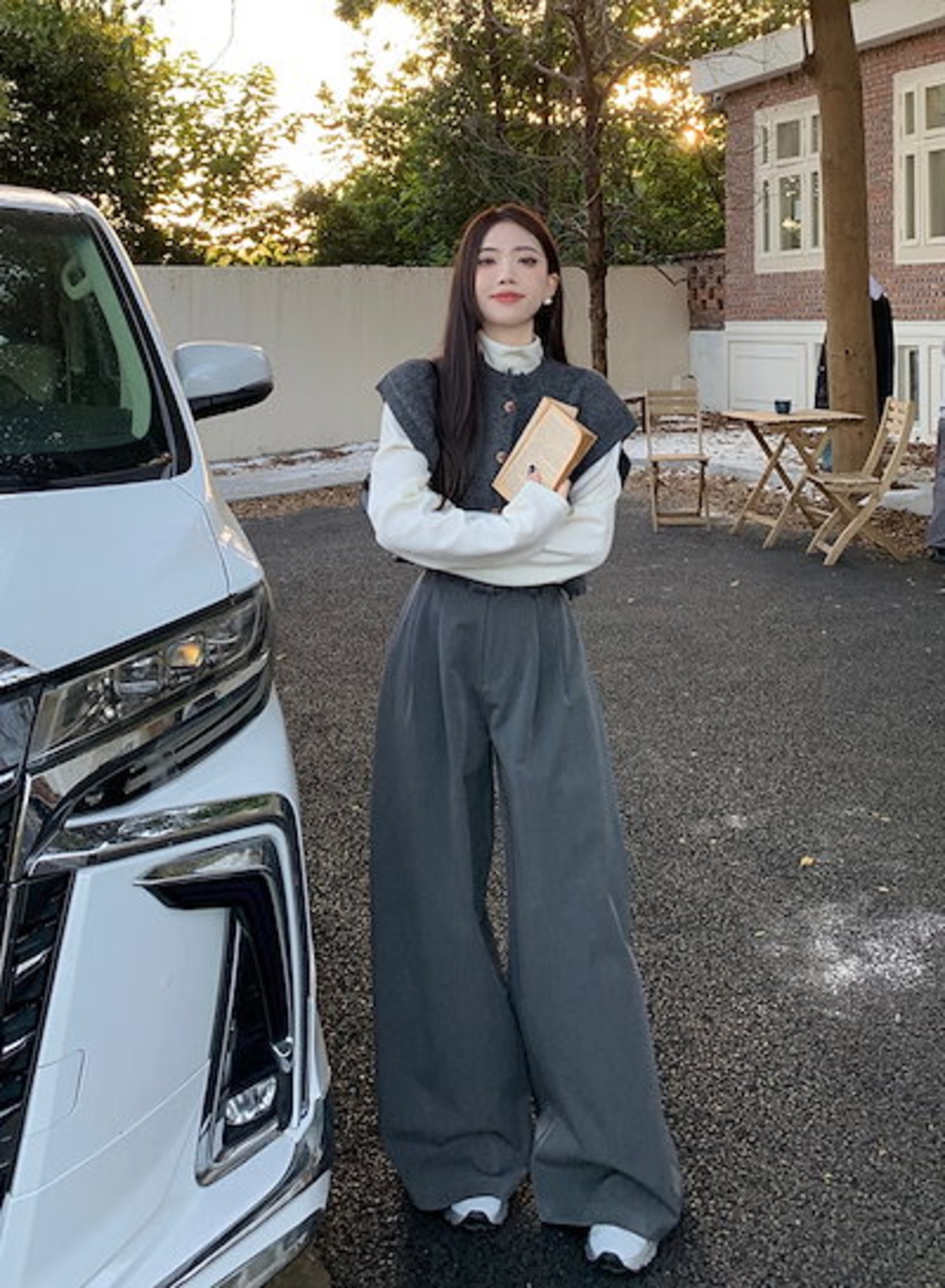 2024秋冬 重ね着風 ショート丈 レイヤード トップスニットベスト ハイネックレディース 3点セット Vネック ノースリーブ カジュアル ワイドパンツ ホワイト クール 通勤オフィスきれいめ上下