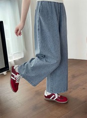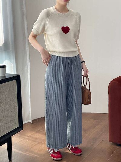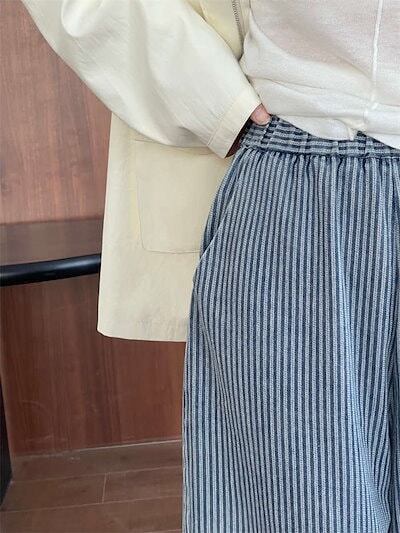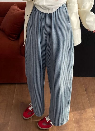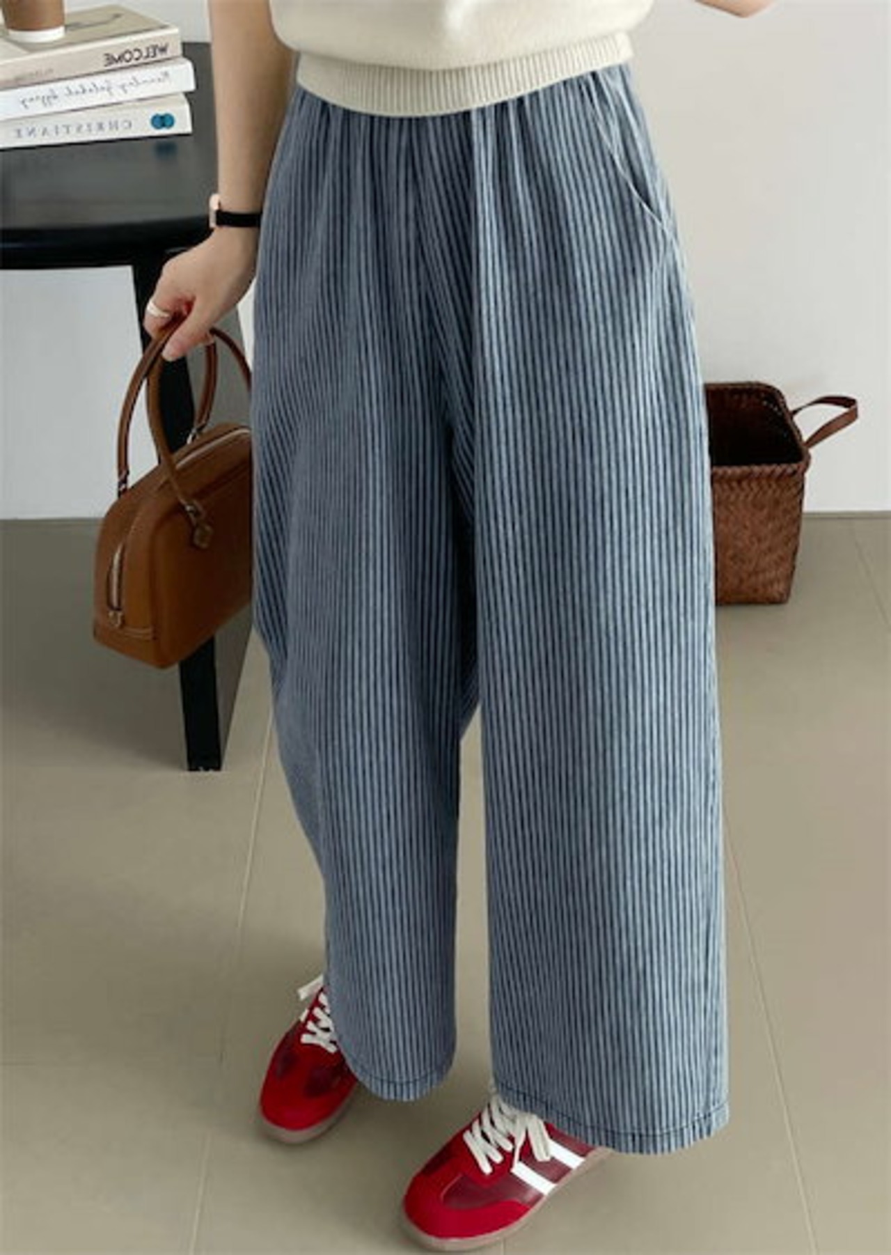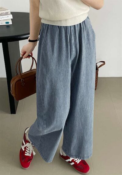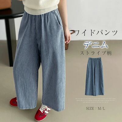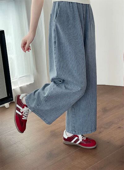 ワイドパンツ デニム レディース ワイドパンツ オールシーズン ジーンズ ズボン ボトムス デニムパンツ ストレッチ ゆったり 春 夏 秋 冬 コットン ポケット ウエストゴム 柔らかい ストライプ柄