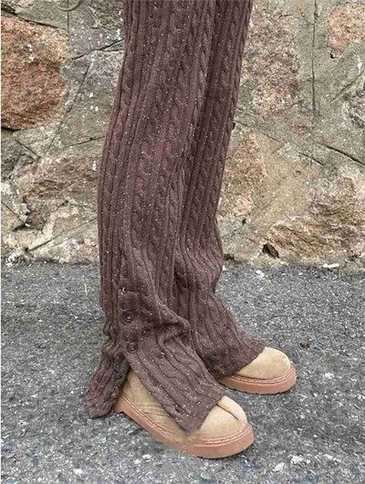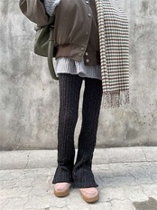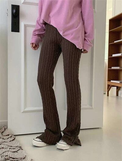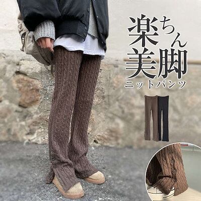 パンツ レディース ボトムス リブニット ケーブル編み フレアパンツ サイドスリット ケーブルニット ロングパンツ ニットパンツ ロング 秋冬 きれいめ ワイドパンツ ハイウェスト フレアニットパンツ