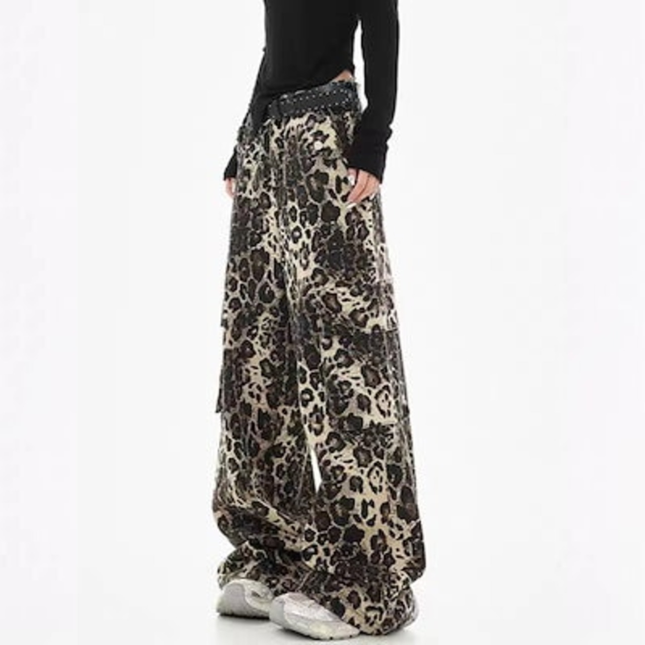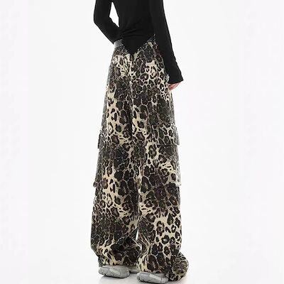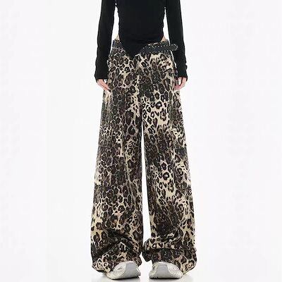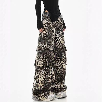 デニムパンツ レディース 豹柄 秋 冬 ワイドパンツ 体型カバー 着痩せ 防寒 保温 ジーンズ ロングパンツ ボトムス