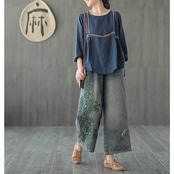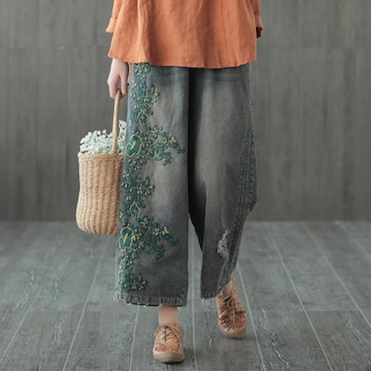 花柄刺繍 サルエルパンツ デニムパンツ ワイドパンツ バギーパンツ ガウチョパンツ レディース ウエ