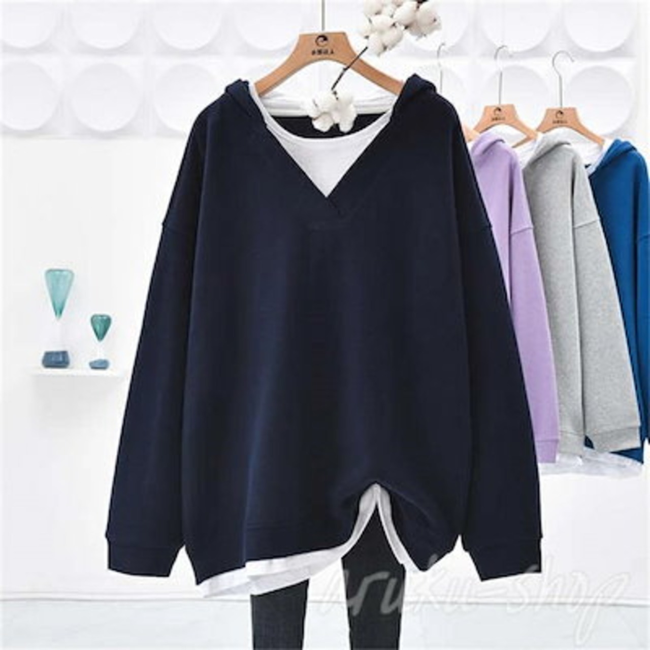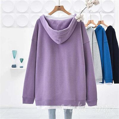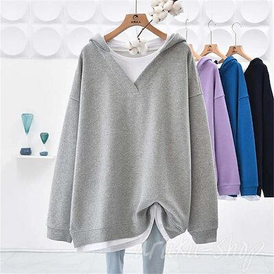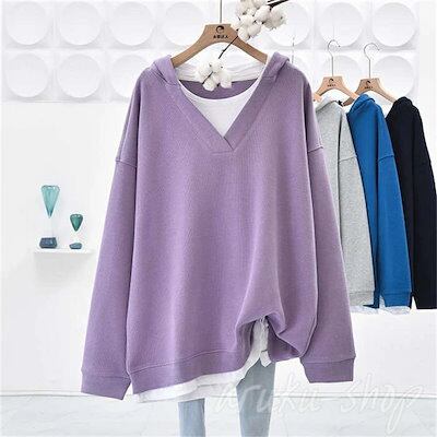 パーカー レディース 長袖 Vネック 重ね着 レイヤード風 春 秋 トレーナー フード付き パーカー 切り替えス
