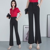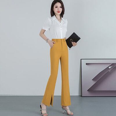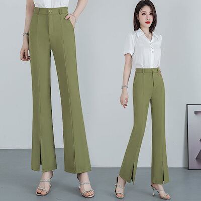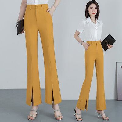フレアパンツレディースストレートパンツベルボトムパンツ細身裾フレアスリットパンツアイスシルクパンツハイウェストパンツスリムスラックススリット入り脚長効果大きいサイズオフィスカジュアルSMLXL2XL3