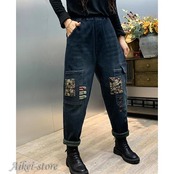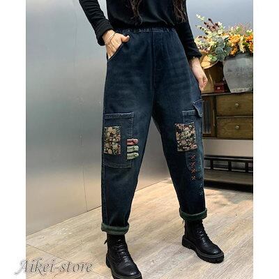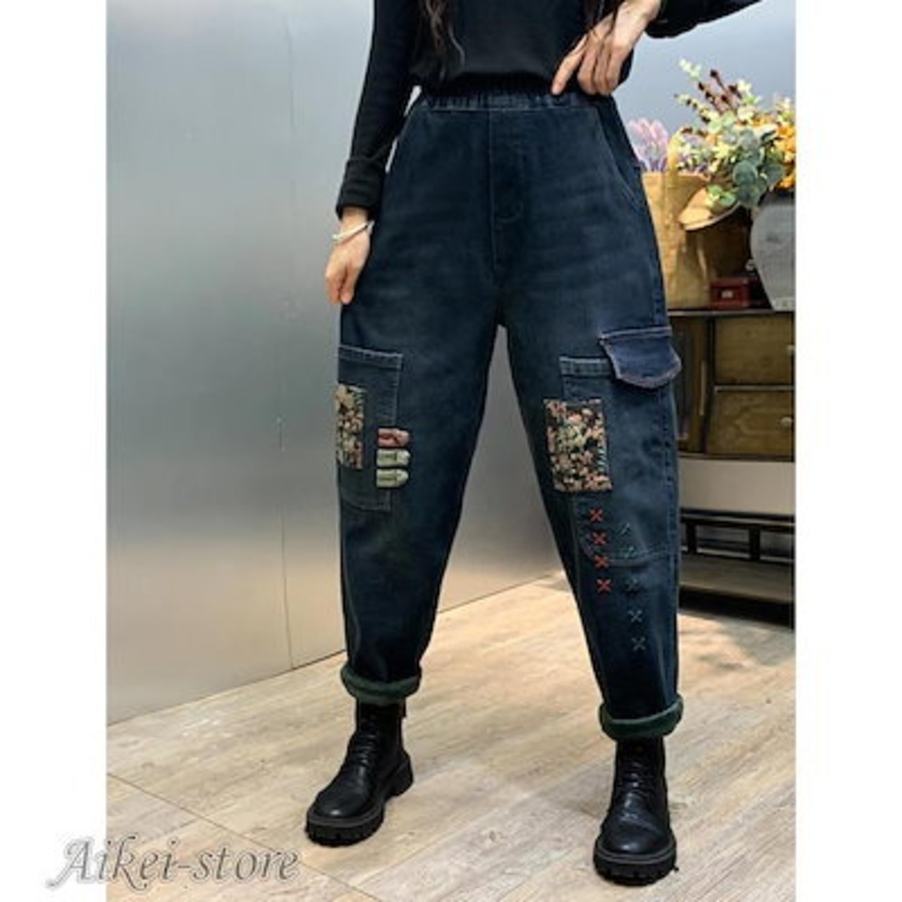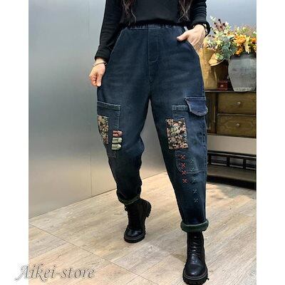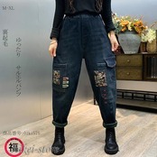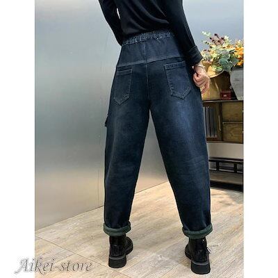 サルエルパンツ デニム 裏起毛 テーパードパンツ ボトムス ズボン レディース カジュアル ポケット付き ゆったり ウエストゴム 無地 着痩せ