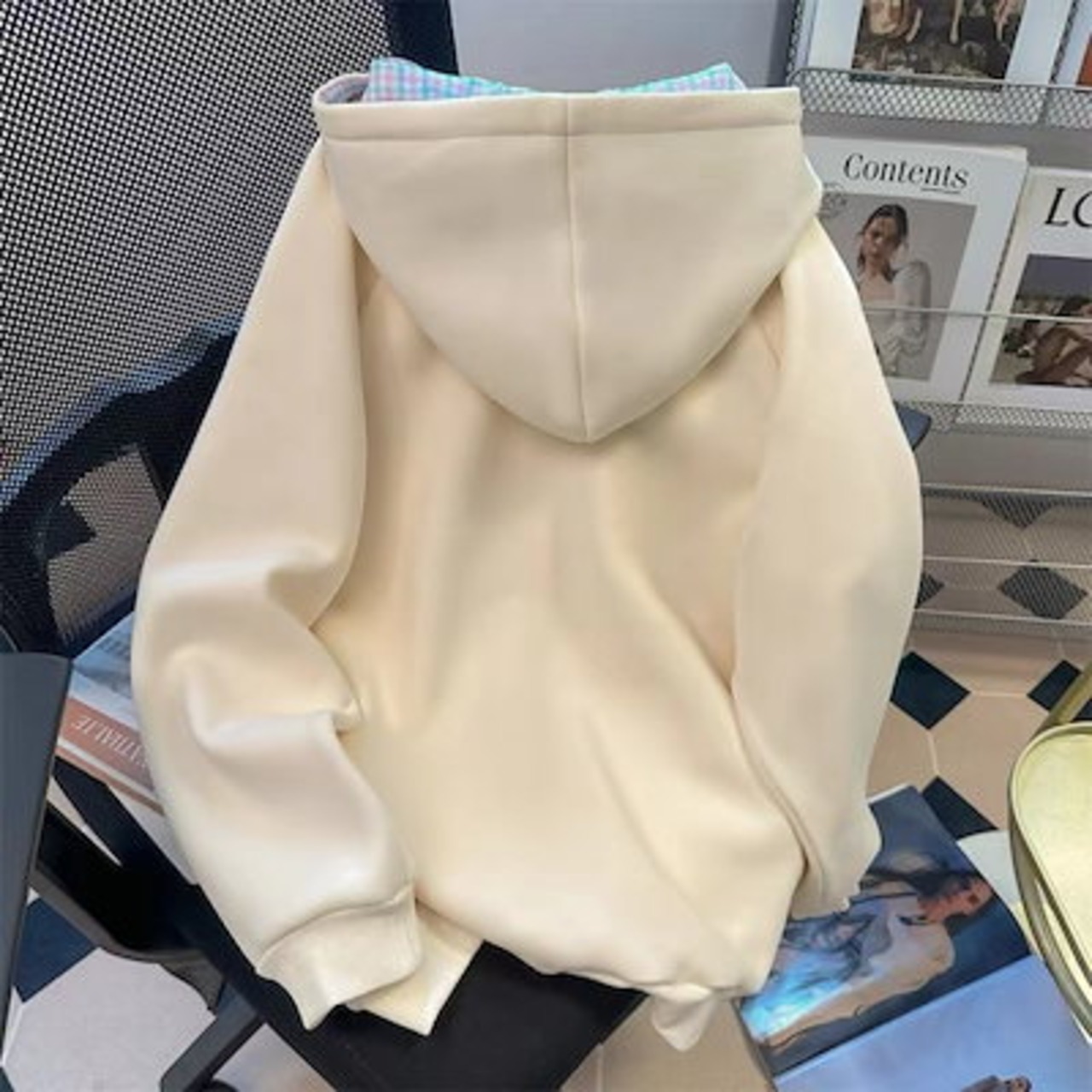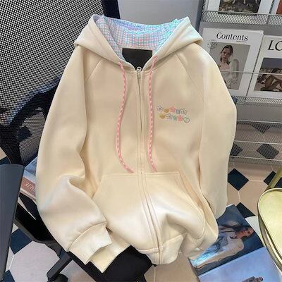 日系可愛い刺繍チェックのパッチワークパーカーレディース秋冬甘いトップスカーディガンジップコート