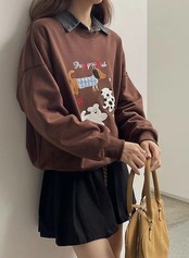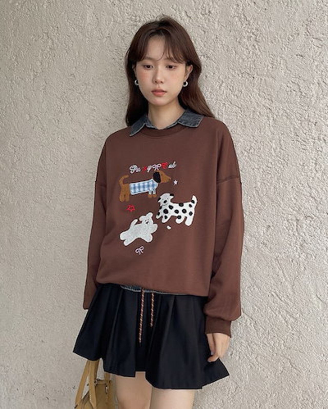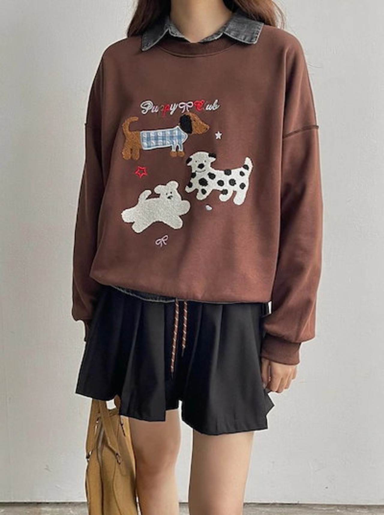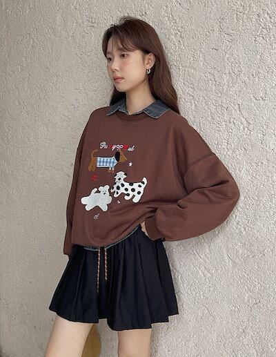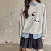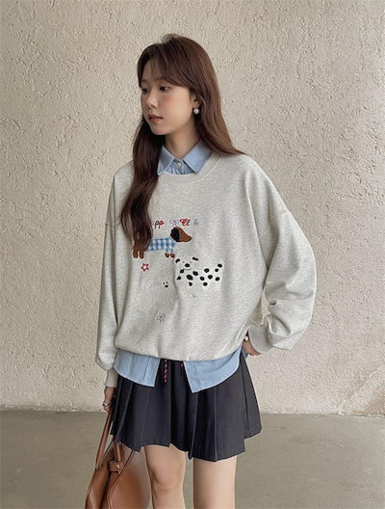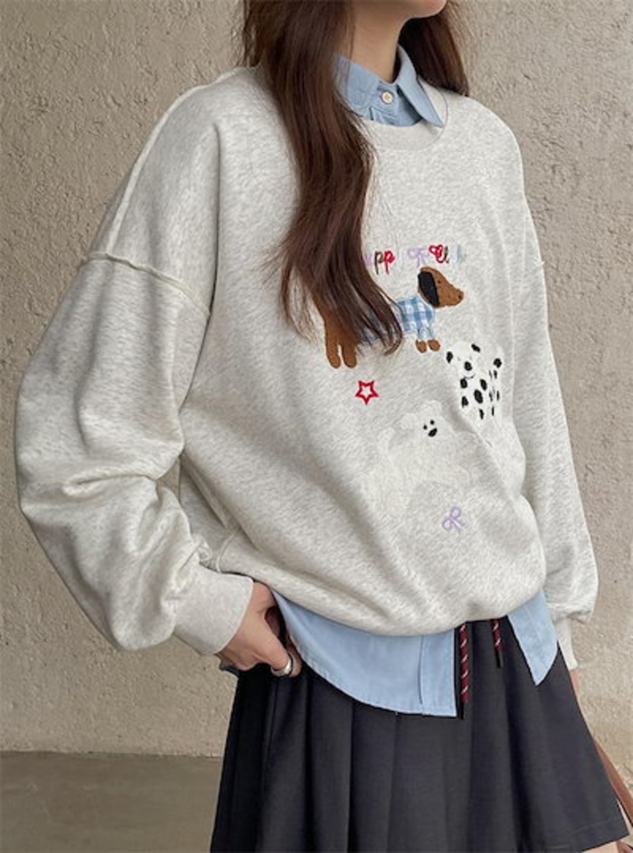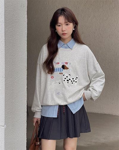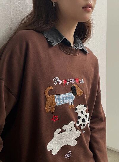 スウェット レディース おしゃれ トレーナー 秋 春 ゆったり プルオーバー 春秋 トップス パーカー 長袖 犬柄 刺繍 クルーネック カジュアル トップス 秋冬 シンプル 可愛い プルオーバーパーカ