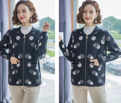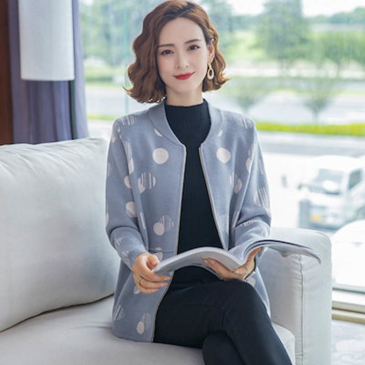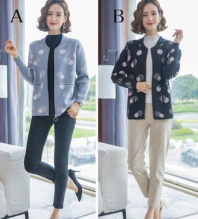 レディース 婦人服 カーディガン ジッパーカーディガン バブルドット 水玉 トップス アウター 羽織 長袖 ベースボールカラー リブ袖 大人可愛い ミセス シニア 20代 30代 40代 50代 60