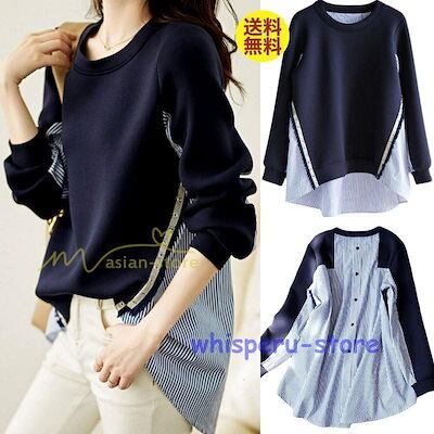 トレーナー レディース 春秋 トップス シャツ 切り替え カワイイ 長袖 Tシャツ 前後差 ゆったり 20代30代 レイヤード 重ね着風 女の子 ストライプ 無地 大人
