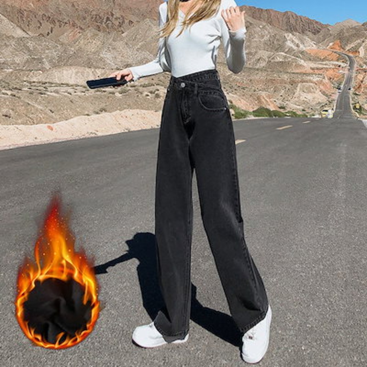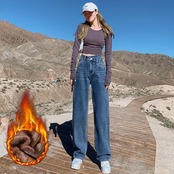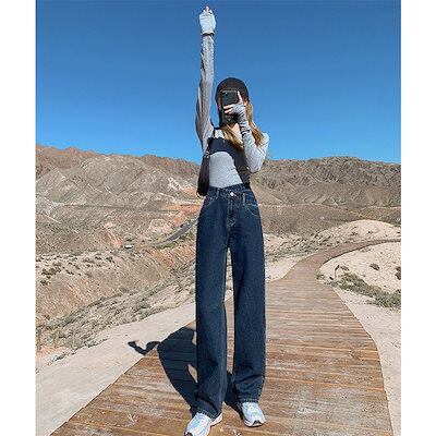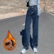 デニムパンツレディースデニムワイドパンツジーンズボトムスキニー着やせゆったりトレンドハイウエスト裏起毛暖かい裏ボア