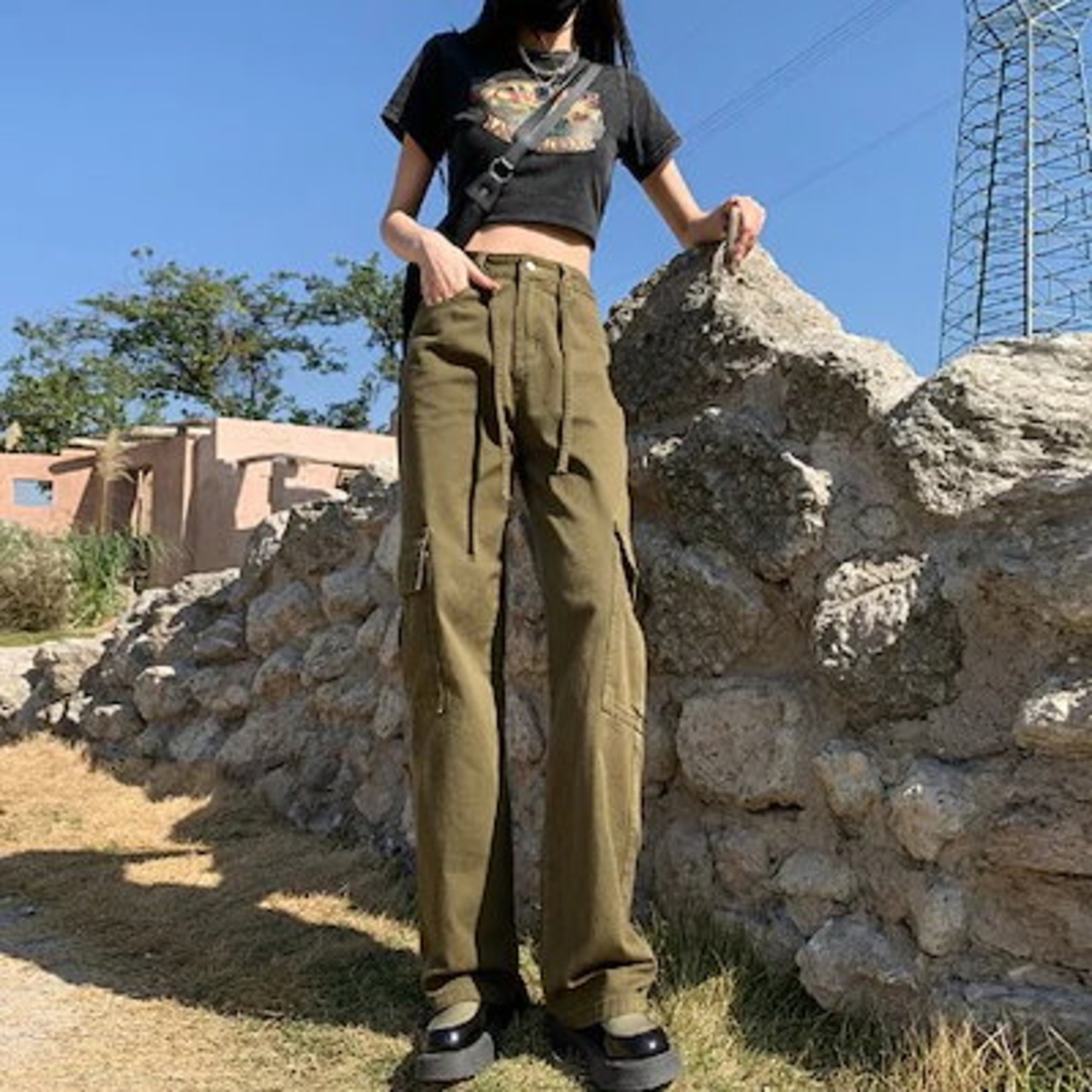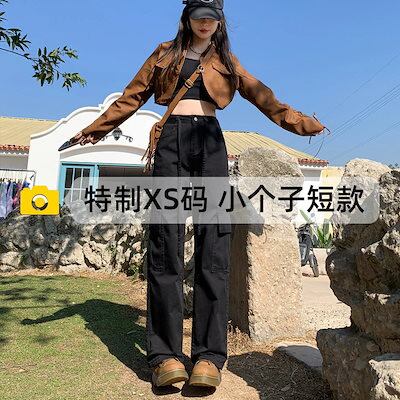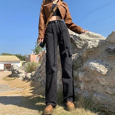 ジーンズ秋冬50 スモールブラックオーバーオールレディース春秋ハイウエストナローストレートジーンズワイドレッグハイキングパンツジーパン