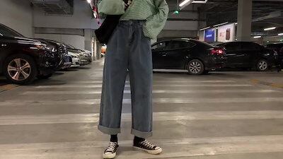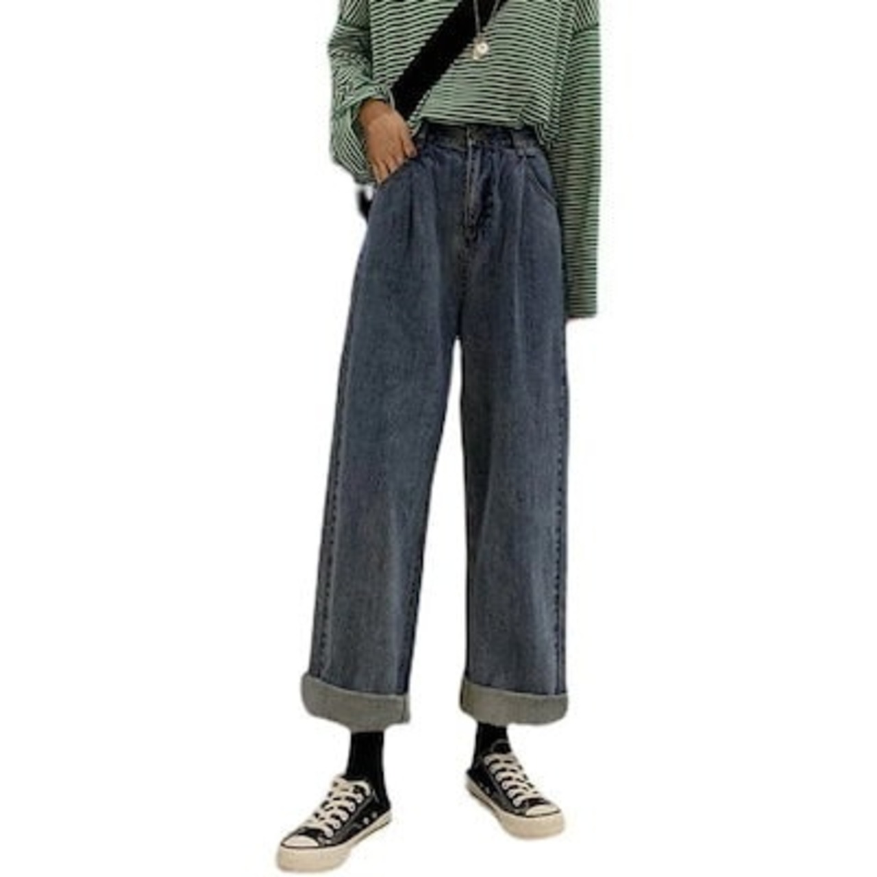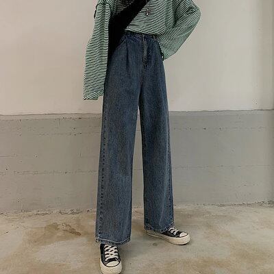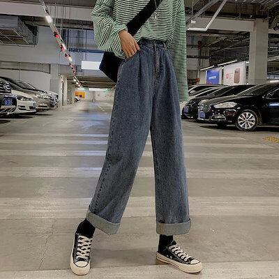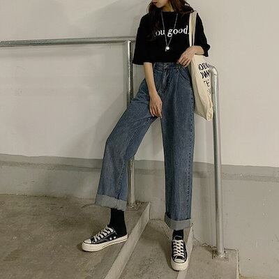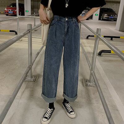 デニムパンツ 韓国のシンプルなハイウエストスリムストレートジーンズレディース ワイドパンツ デニムボトムス