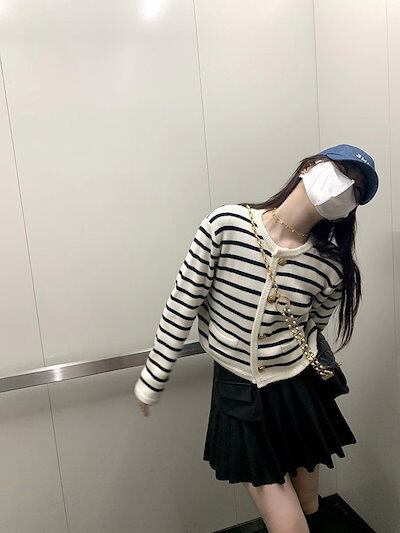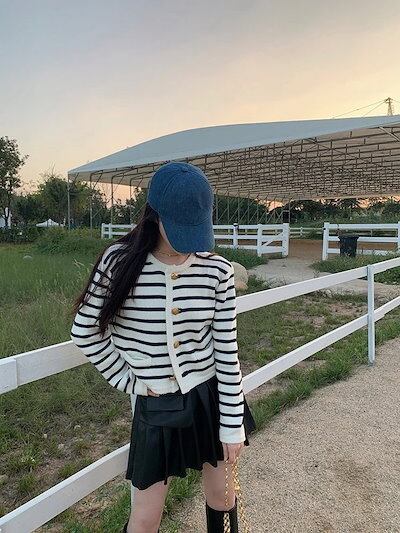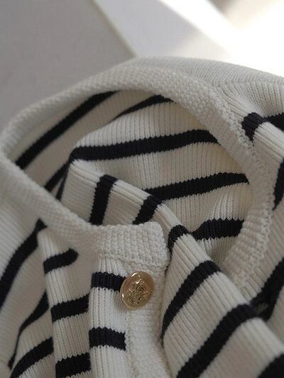 ゴールドボタン コントラストカラー ストライプ ラウンドネック 小フレグランス風 ニットカーディガン レディース フレンチルース ショート セーター ジャケット