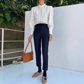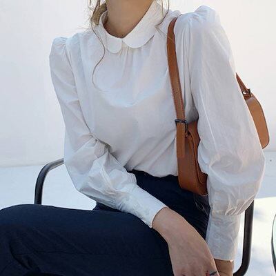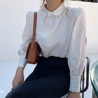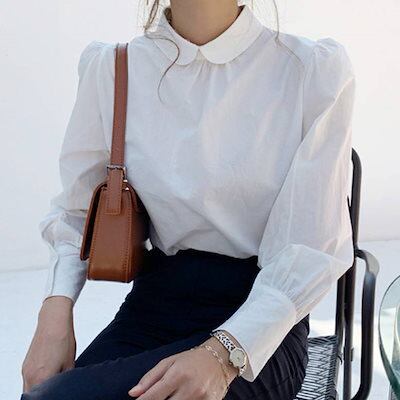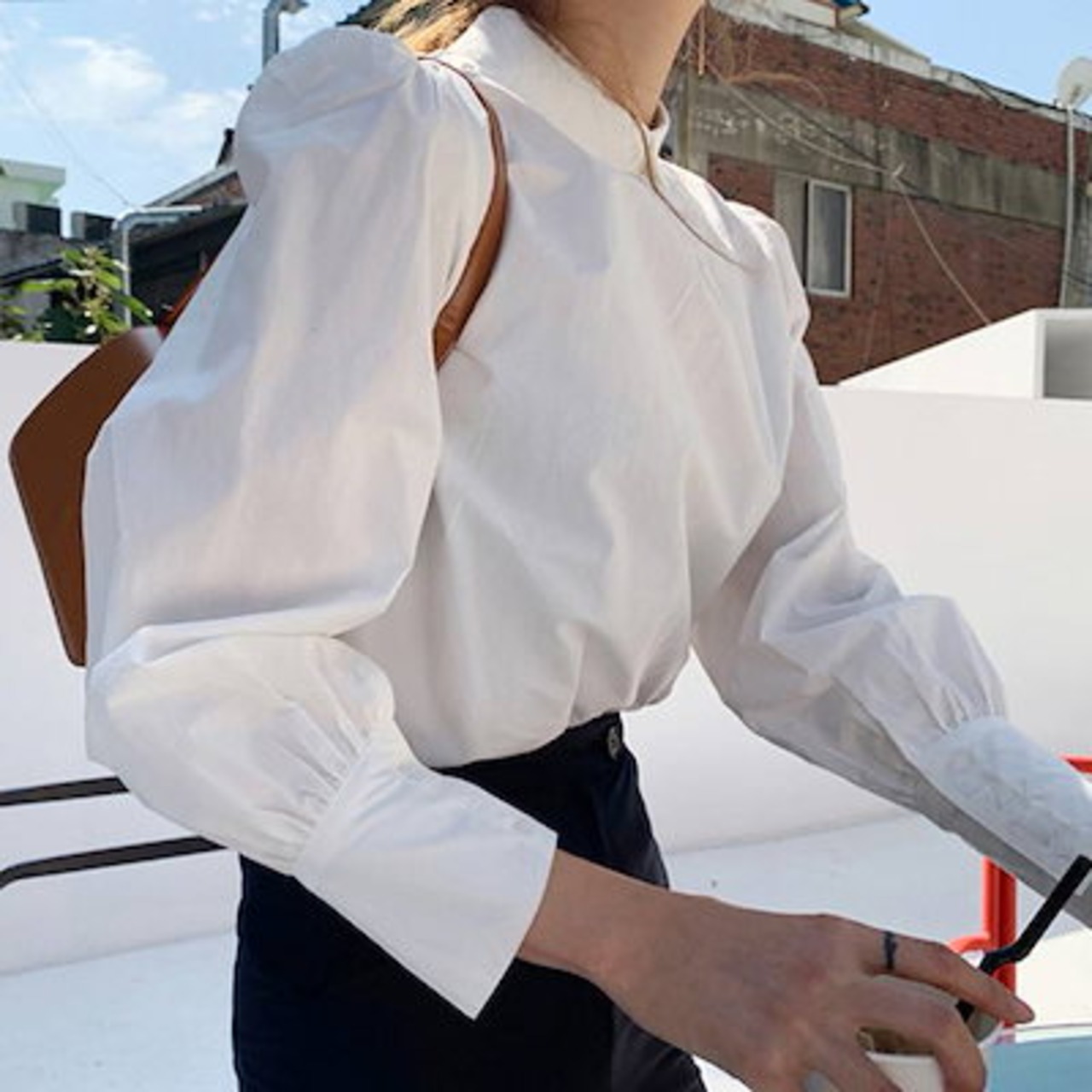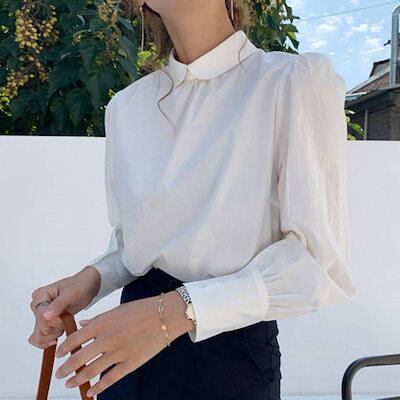 レディース パワーショルダーブラウス バックボタン トップス シャツ ブラウス 長袖 白シャツ 襟付