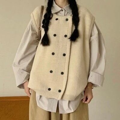 2025春夏トップス ベスト ニット ラウンドネック ダブルボタン ノースリーブ ゆったり 春 ベージュ オフホワイト 韓国ファッション レディース おしゃれ かわいい カジュアル お出かけ30%まで