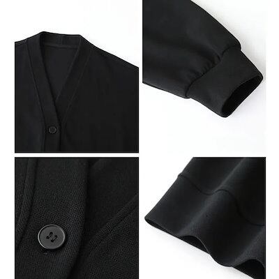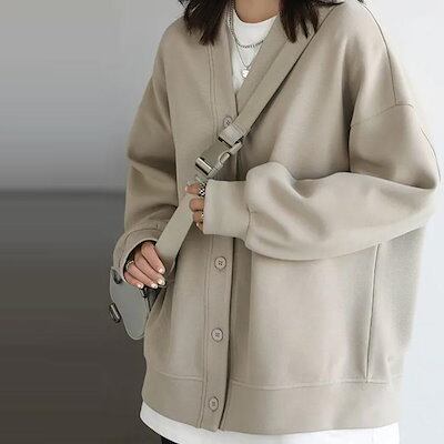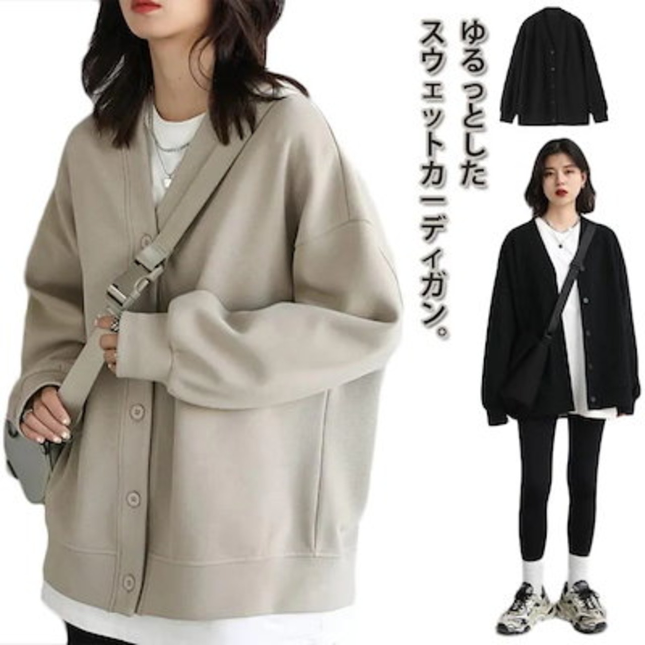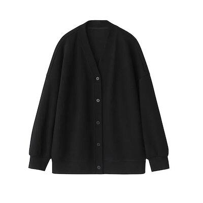 スウェットカーディガンレディーストレーナー長袖トップスパーカージャケットライトコートVネック薄羽織りビッグシルエット大人かわいい大きいサイズゆったり体型カバー着痩せボタン重ね着通学通勤服服黒コット