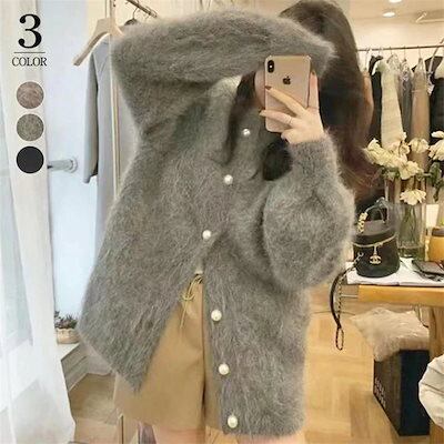 パールボタン ふわふわ ニット カーディガン 長袖 レディース 丸首 クルーネック もこもこ モヘア 秋 冬 おしゃれ カジュアル
