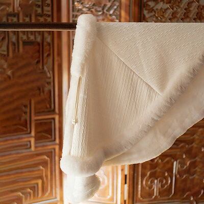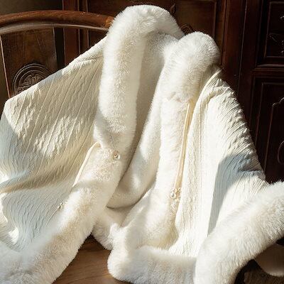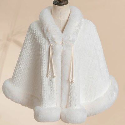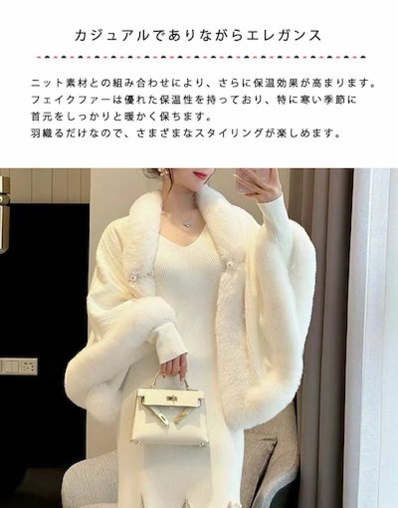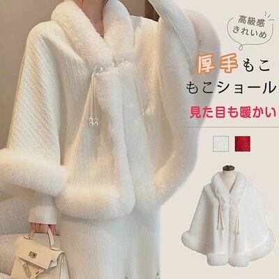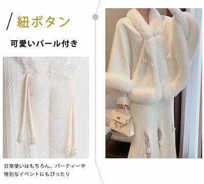 もこもこファーショール レディース 厚手 ストール ポンチョ フェイクファー ボレロ 冬 ふわふわ ニット 編上げ ケープ パール付き 大判 暖かい 振袖 着物 和装 超可愛い ボタン マント アウタ