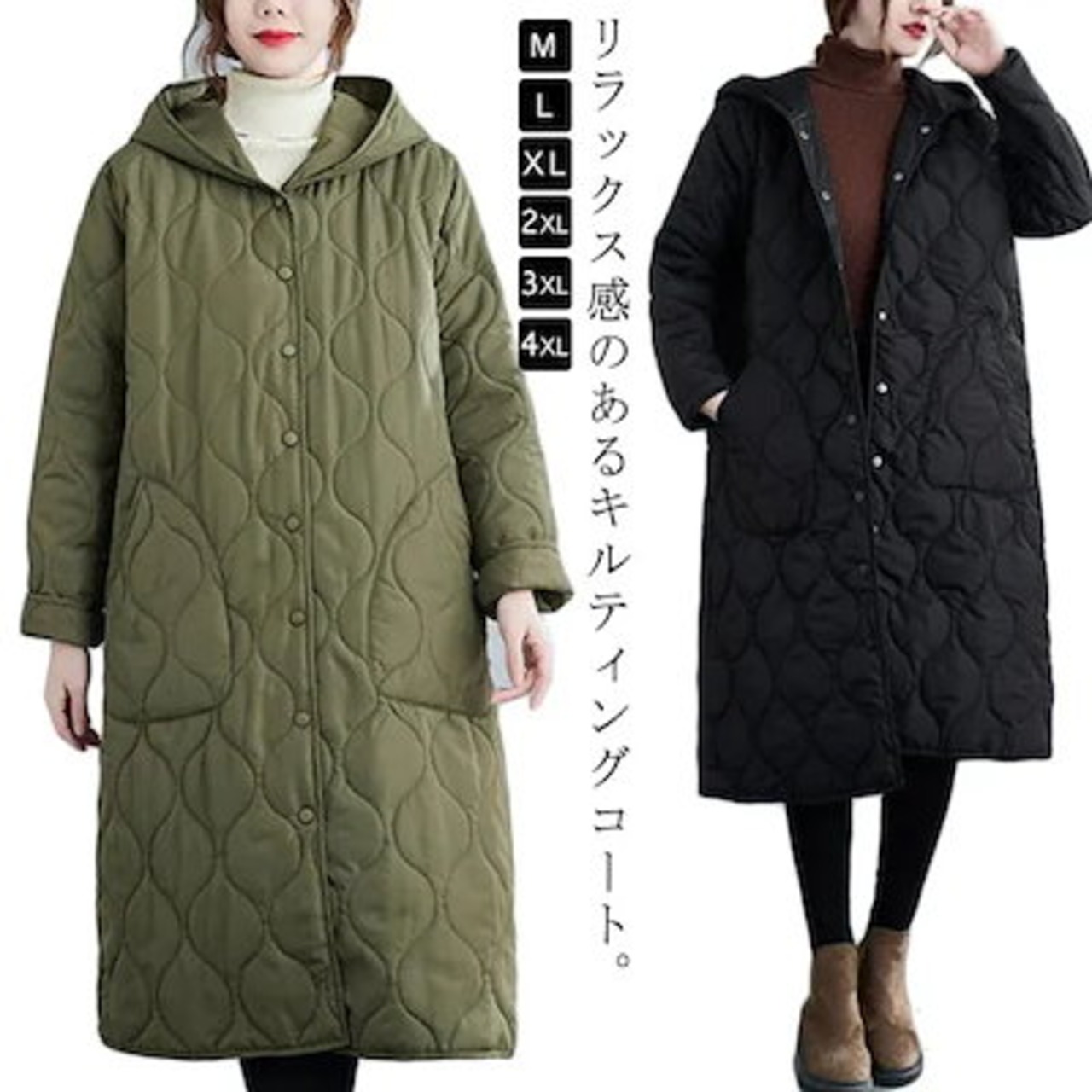 キルティングコート レディース 中綿 アウター ジャケット 長袖 上着 フード付き ロング丈 ポケット付き 前ボタン 膝下 羽織 体型カバー ゆったり 大きいサイズ 無地 全2色