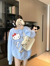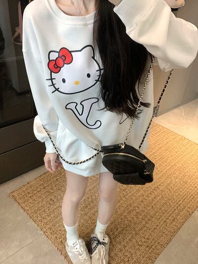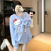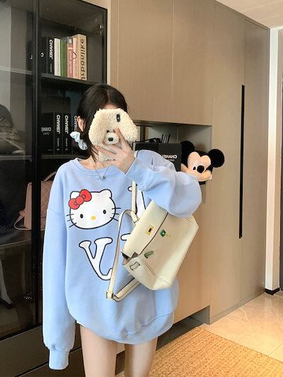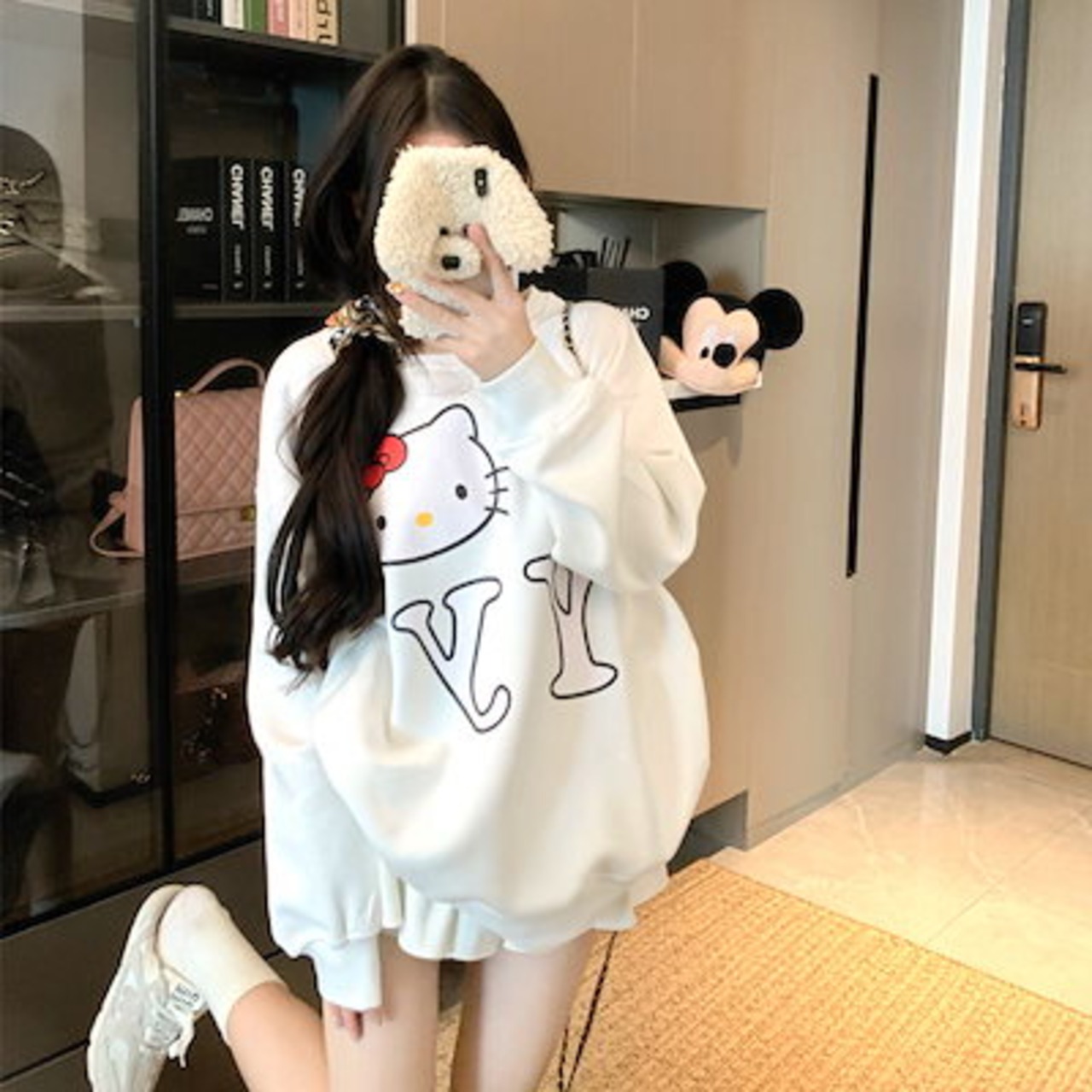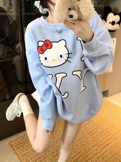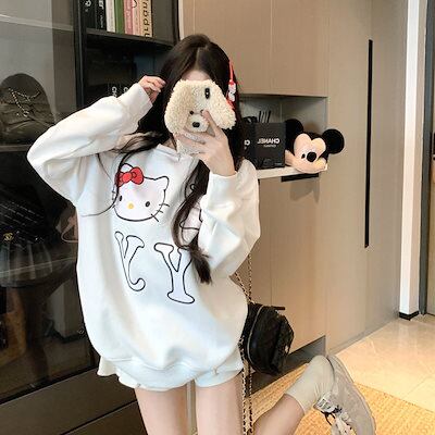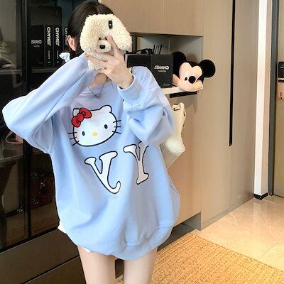 新しい カジュアル 韓版 ゆったり hello kitty プリント ジャージ 裏起毛 着痩せ ラウンドネック レディース パーカー