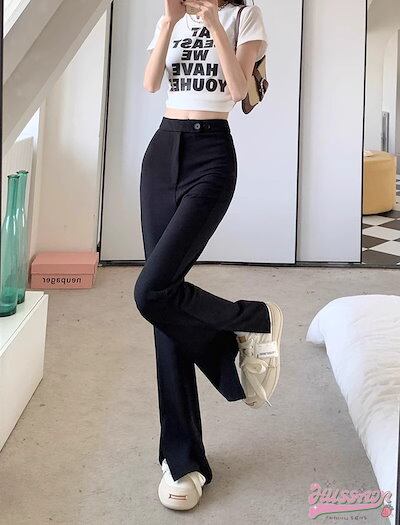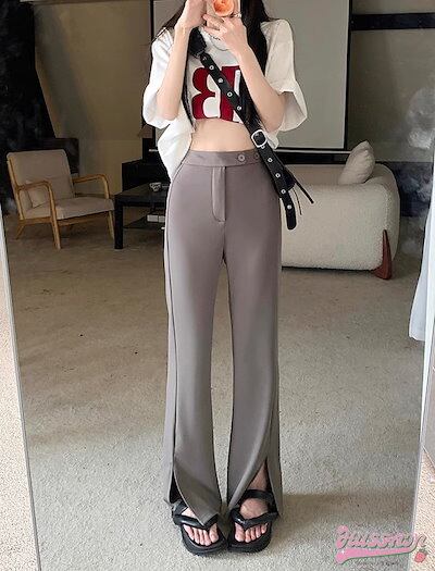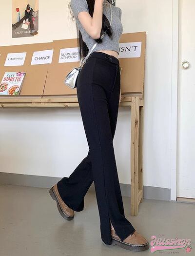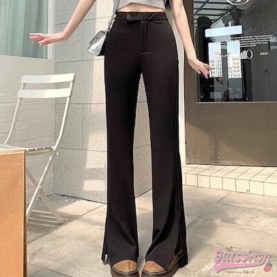 ボトムス レディース ハイウエスト ストレート レースアップ スリット スラックス カジュアルパンツ ブラック グレー きれいめ お姉さん きちんと 大人っぽ 大人女子 上品 スタイルアップ 美脚 脚