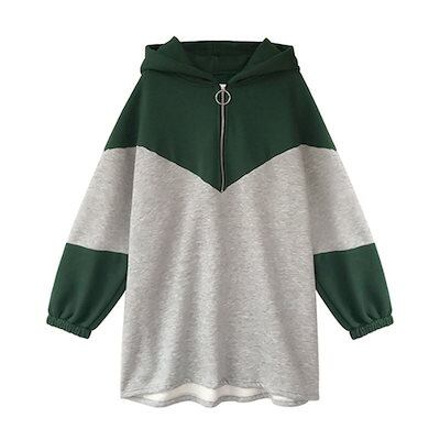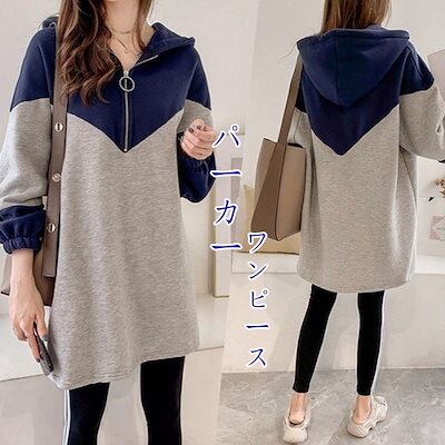 韓国ファッション 長袖 パーカー スウェット ワンピース チュニック 大きいサイズ 薄手のフリース 色切り替え ゆったり 高級感 レディース 着やせ 綿麻 トップス 体型カバー