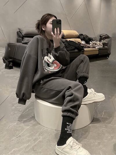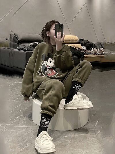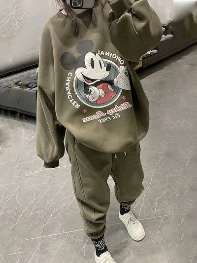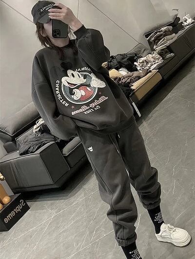 新しい 【2024新品入荷激安本日限定】ミッキープリントベルベットスポーツスーツレディース2024春ラウンドネックスウェットシャツとスウェットパンツツーピースフード付きスウェットシャツ