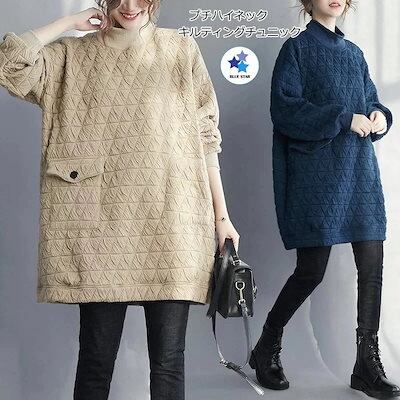 チュニックワンピース秋冬レディースパーカートップスプルオーバーキルティングロング丈無地チュニックワンピース長袖ハイネック大きいサイズゆったりアウターワンピースタートルネック体型カバーカジュアル