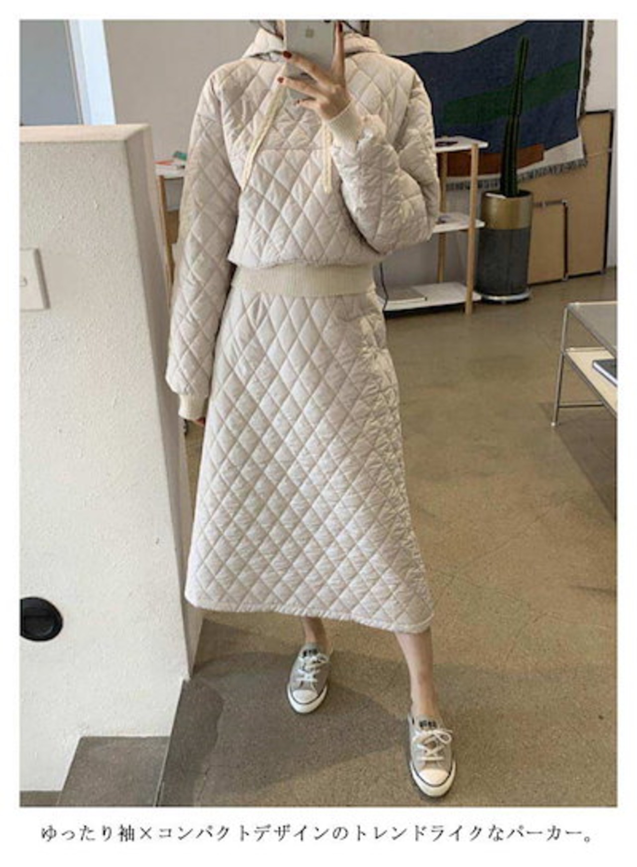 新作入荷 キルティング セットアップ レディース キルティング パーカー スカート 2点セット 中綿 キルト プルオーバー フード付き 秋 冬 服 中綿パーカー 中綿スカート 大人可愛い カジュアル