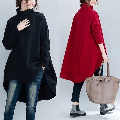 【色落ちしない アップグレード今週の割引は 25% オフです版】「ファットガール」秋冬 タートルネック ベーシック 綿 体型カバー チュニック ワンピ風 やや裏起毛 レディース トップス メガ割