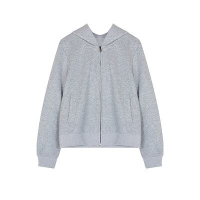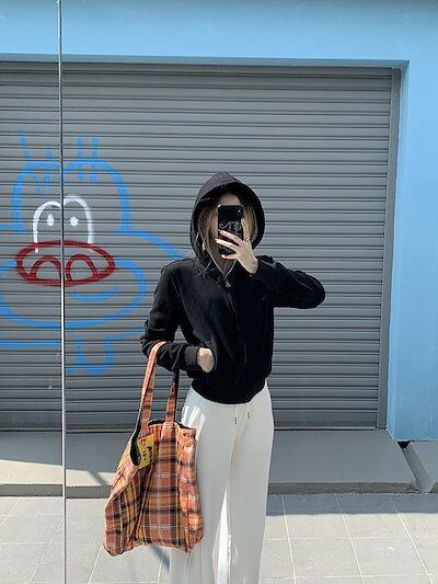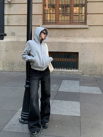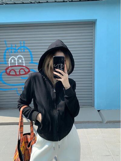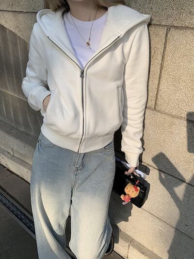 2024秋冬トップスかわいい2TYPE 厚手 裹起毛 パーカー フード付き韓国風長袖ゆったり白黒おしゃれレトロチャックシルエット韓国フルサイズファッション系ルーズレディースサイド学生通学トラック羽織り