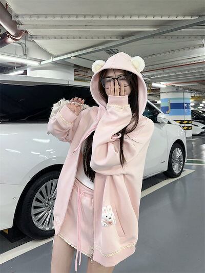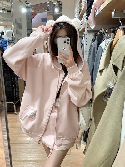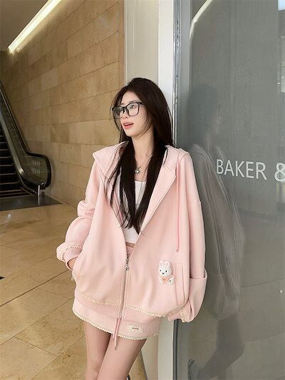 2024 秋冬トップスかわいいパーカー フード付き韓国風長袖ゆったり細見え白黒おしゃれレトロチャッシルエット甘め大人っぽ韓国フルサイズファッション系ルーズレディースサイドお出かけ学生通学トラック羽織り