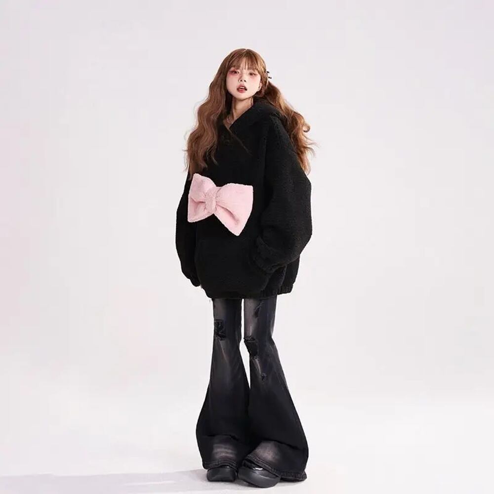 ピンクの弓、パーカー、プレッピースタイル、プルオーバー、カワイイ、韓国、猫の耳、甘い、y2kの女性用長袖スウェットシャツ パーカー ジャージ y2k T240908170311_01
