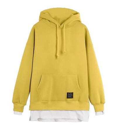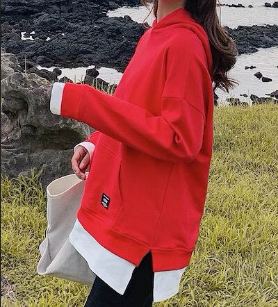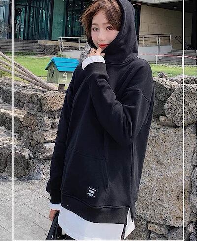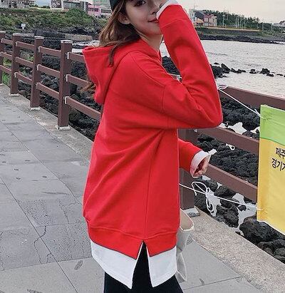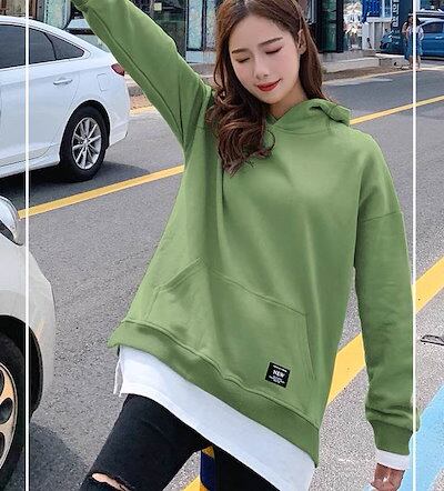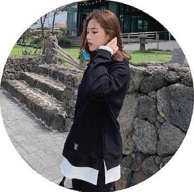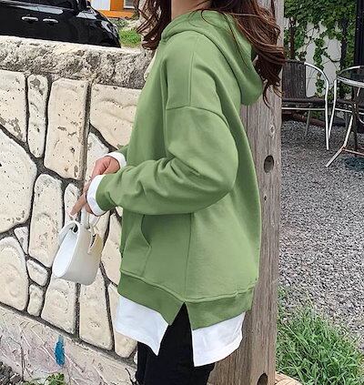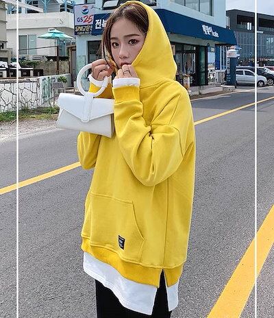 レディース トップス パーカー フェイクツーピース ロング お尻まですっぽり 長袖 フード ワイド かわいい 大人可愛い シンプル カジュアル おしゃれ かっこいい レトロ ラフ スポーティー ガーリ