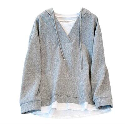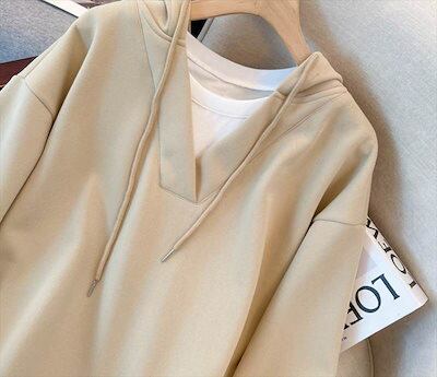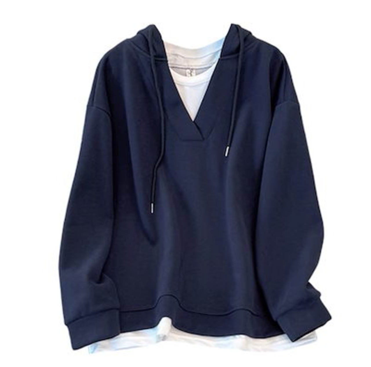 フェイクツーピース レディース トップス パーカー ミドル丈 長袖 Vネック Uネック フード ワイド かわいい 大人可愛い シンプル カジュアル おしゃれ かっこいい レトロ ラフ メンズライク マ