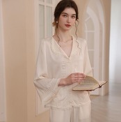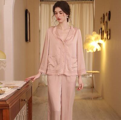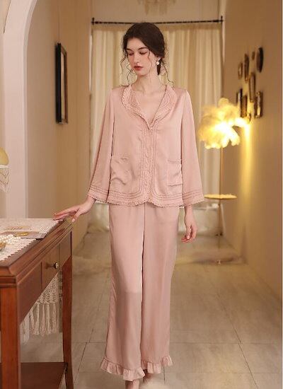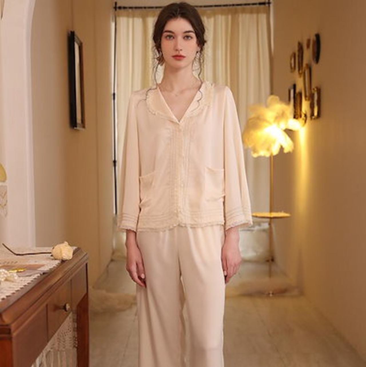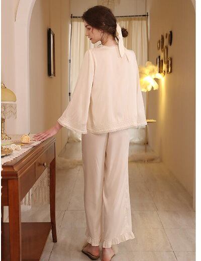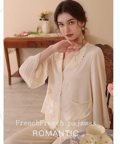 パジャマ上下セット レディース Vネック レース 優雅 フレア袖 長袖春秋夏 冷房 外出着 フランス風 ロングパンツ 姫系 寝巻き パジャマ ロマンティック 女性用 部屋着 ナイトウェア 天使風ルーム